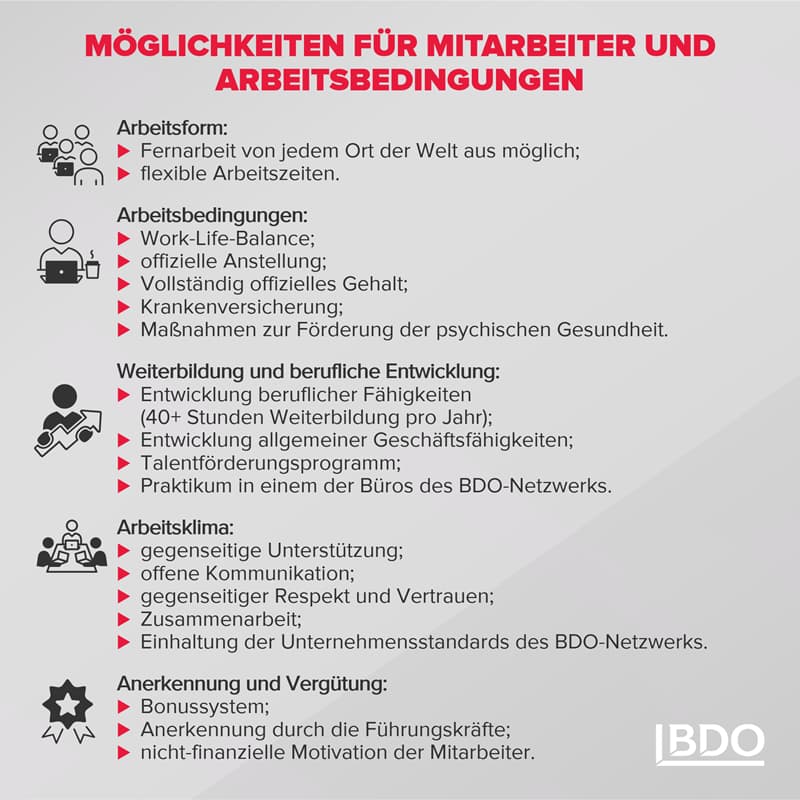 Darüber hinaus bauen wir unseren Personalbestand weiter aus und suchen Fachkräfte aus verschiedenen Bereichen für unser freundliches Team bei BDO in der Ukraine. Aktuelle Stellenangebote finden Sie auf unserer Seite bei Linkedin oder auf den Jobbörsen robota.ua, work.ua, djinni.co