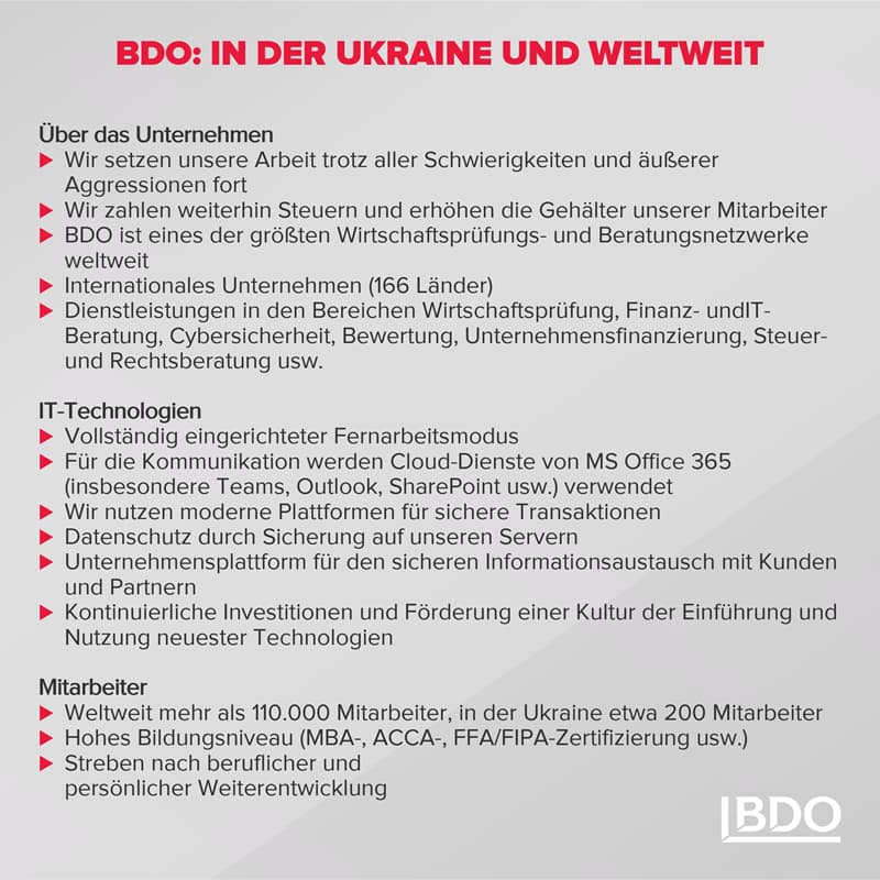 Die Arbeit bei BDO in der Ukraine wird trotz aller Schwierigkeiten und äußerer Aggressionen fortgesetzt. Wir zahlen weiterhin Steuern, zahlen die Gehälter pünktlich und leisten unseren Mitarbeitern zusätzliche materielle Unterstützung. Während des Kriegsrechts in der Ukraine unterstützt BDO als Arbeitgeber seine Kollegen und deren Familien bei der Suche nach einer Unterkunft im Westen der Ukraine und in Europa. Darüber hinaus bieten wir Mitarbeitern, die in Kyjw und Dnipro bleiben, moralische und materielle Unterstützung an.