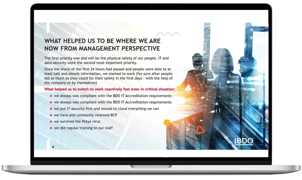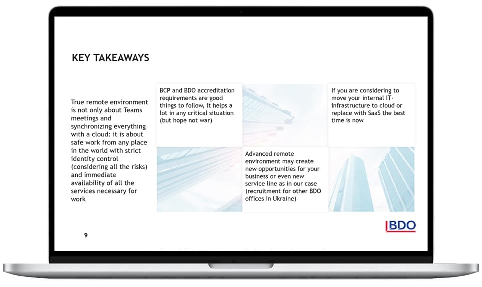 Під час виступу «Безперервність бізнесу в критичних і надзвичайних ситуаціях: Приклад BDO в Україні» ми розповіли про свій унікальний досвід роботи в екстремальних обставинах разом з командою Global IT. З початку війни нам було необхідно забезпечити безпеку співробітників і важливих даних навіть під час евакуації та віддаленої роботи з різних регіонів України та інших країн. Ми розглянули реплікацію даних у хмару як екстрене виконання BCP, розповіли про поліпшений моніторинг безпеки та проактивні засоби контролю (зокрема геоблокування). Також поділилися з колегами планами про подальшу довгострокову трансформацію ІТ-інфраструктури і дали просту та цінну пораду: найкращий час для перенесення всієї IT-інфраструктури на хмару — ПРЯМО ЗАРАЗ.